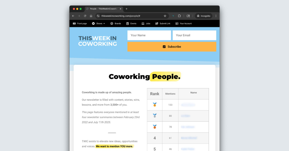Coworking People. Coworking is made up of amazing people. Our newsletter is filled with content, stories, wins, lessons, and more from 3,010+ of you. This page features everyone mentioned in 4+ newsletter summaries, between February 23r...